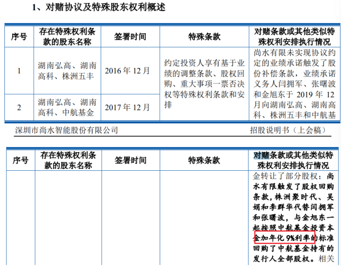 2016年12月,发行人开始引进了外部投资机构,湖南弘高、湖南高科、株洲五丰以合计2,200万元认缴尚水有限新增注册资本约111.11万元,2017年12 月,湖南弘高、湖南高科、中航基金以3,500万元认缴尚水有限新增注册资本约83.63万元,同时,公司及大股东均与上述投资者签订了有关业绩承诺、上市安排等对赌协议。