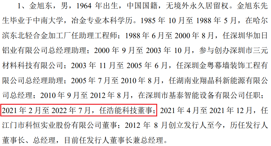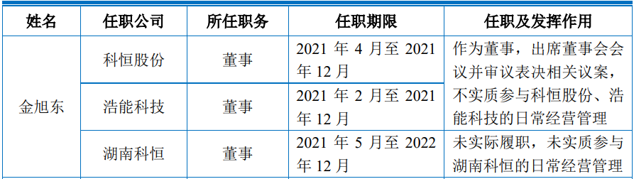2021年年末,科恒股份并购发行人的计划终止,金旭东于2021年12月辞任了科恒股份、浩能科技两家企业的董事、于2022年12月辞任了湖南科恒董事职务,但此次上市招股书披露的和这存在差异且未披露湖南科恒履职的信息。
