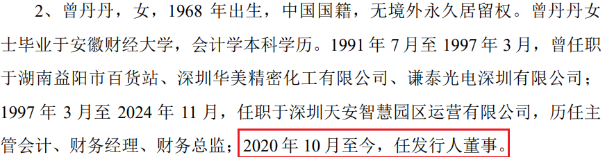招股书显示,发行人配偶曾丹丹并未纳入共同实控人之列,据公司科创板问询函显示,曾丹丹曾于2015年5月至2017年担任发行人总经理,但在此次上会稿中显示,其仅从2020年10月担任董事,如此前问询函披露的是事实,曾丹丹则同时在发行人和天安智慧园区两家企业任高管。