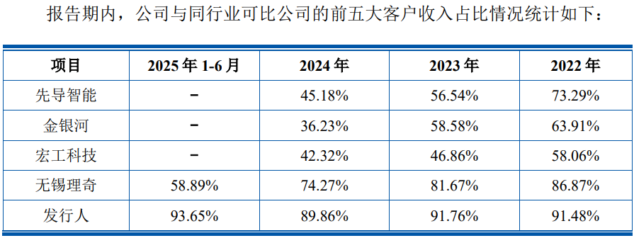 报告期内,公司向前五名客户的销售占比分别为91.48%、91.76%、89.86%和93.65%,在上市同行中最高。