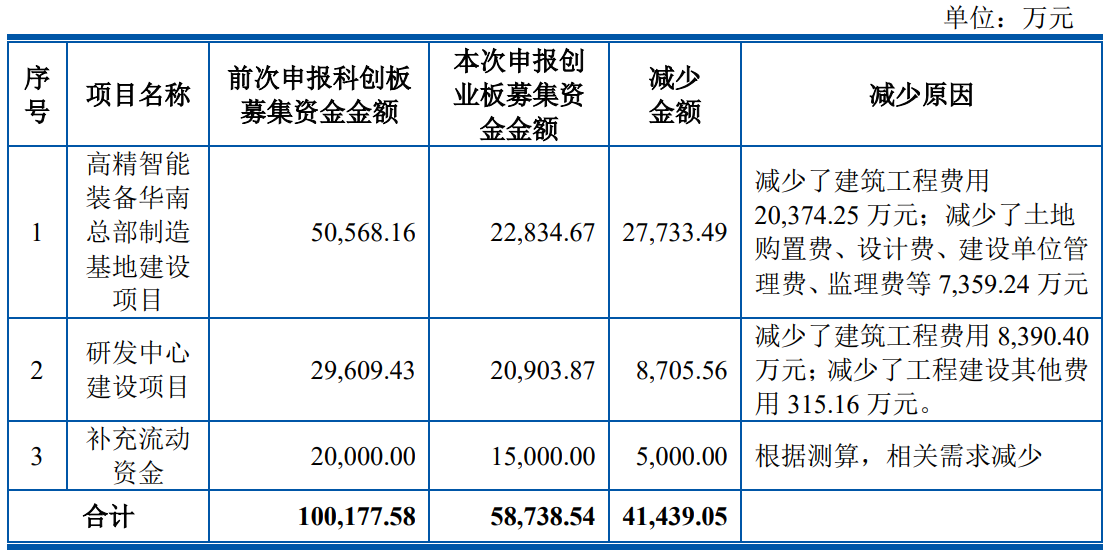 招股书显示,公司此次计划募集资金58,738.54万元,较此前科创板上市募资100,177.58万元,缩水了40%多,问询函显示,减少的资金主要是减少了建筑工程费用及减少了补流资金5,000万元,减少的建筑费用主要由公司自筹的资金进行的先行投入。