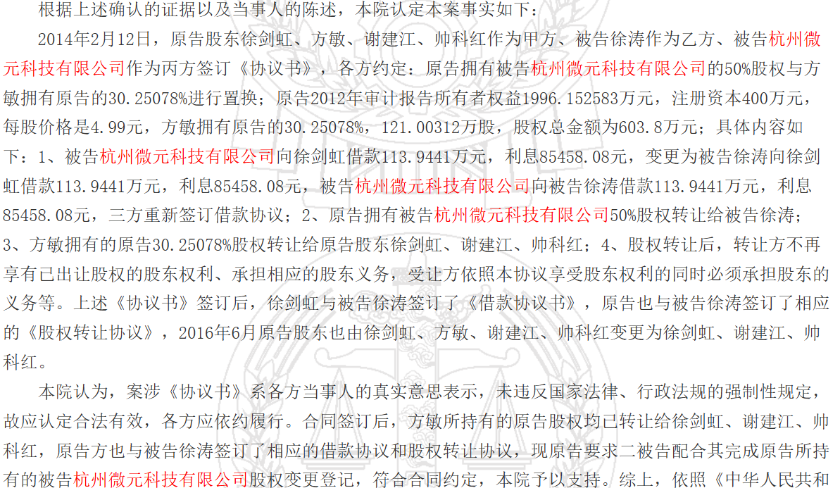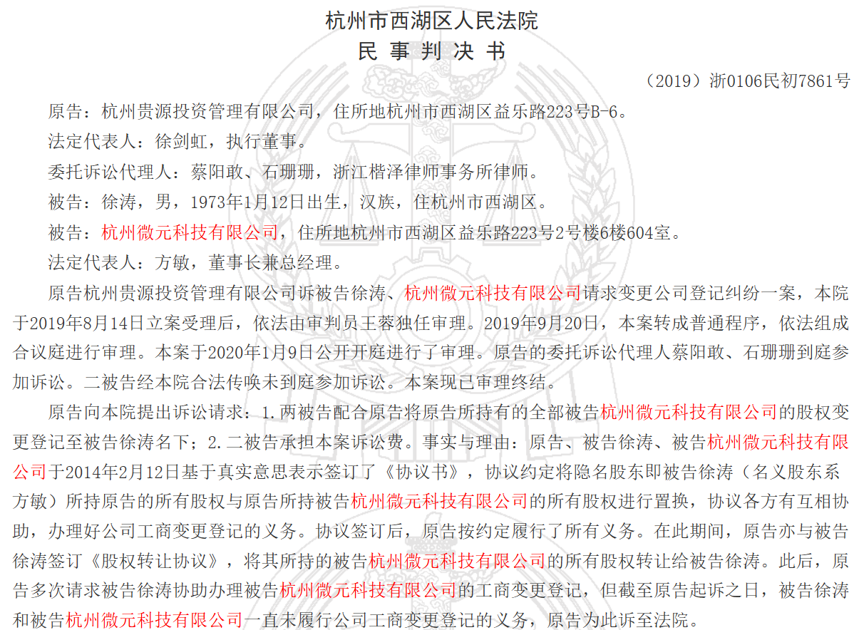2004年,发行人还曾设立杭州微元科技,2010年8月,将股权转让给控股股东贵源控股,微元科技成了发行人兄弟单位,2014年,原创始股东徐剑虹等与徐涛约定进行股份置换,发生了股权纠纷。