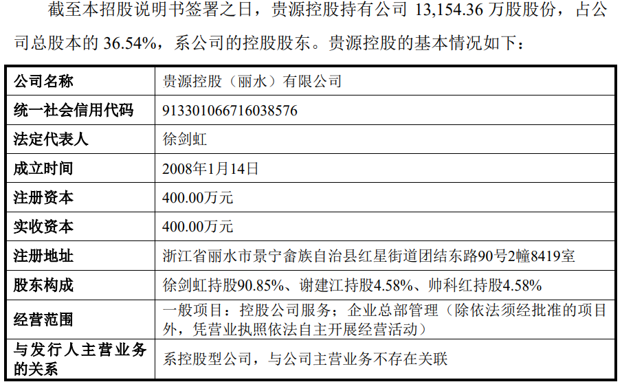 截至发行前,公司的股东达39名,其中,机构股东30名,控股股东贵源控股发行前持股占比36.54%,发行后下降至27.40%。