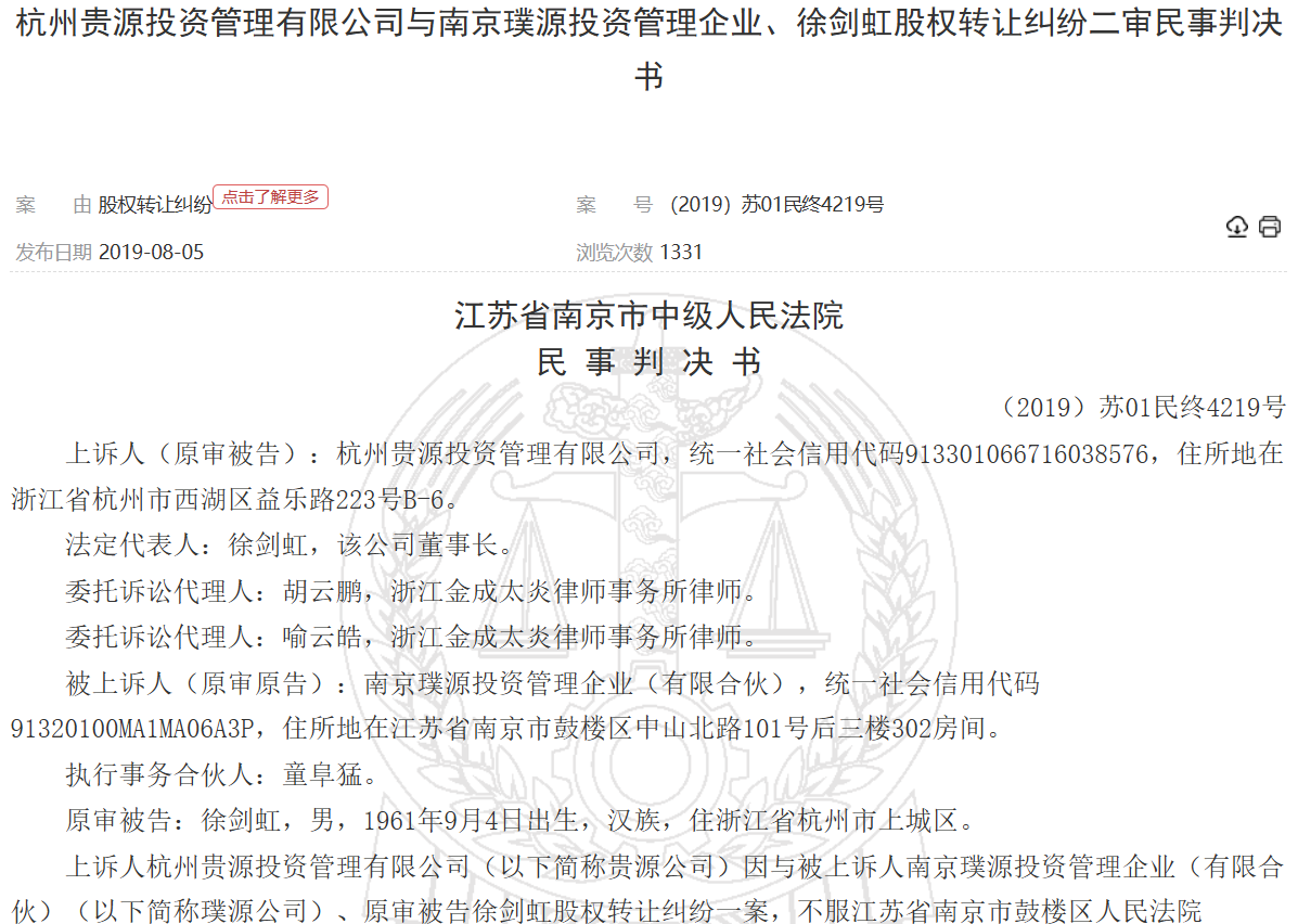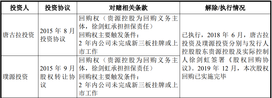 据(2018)苏0106民初12023号民事判决、(2019)浙0106民初5348号民事判决显示,2015年8月,2015年9月,杭州贵源投资管理有限公司(控股股东曾用名)曾与唐古拉投资、璞源投资签订股权转让协议,分别将其2%股权以60万元价格转让给唐古拉公司、6.1538%的股权以400万元价格转让给璞源公司,两家公司均出资到位,2018年6月,双方鉴于发行人经营业绩和未来发展战略与贵源公司的认识产生严重分歧,签订了《股权回购协议》,但控股股东未履行回购义务,并称《股权回购协议》无效,且作为丁方签字的徐剑虹不具有承担担保义务。不过,两起上述均被驳回,维持一审判决。