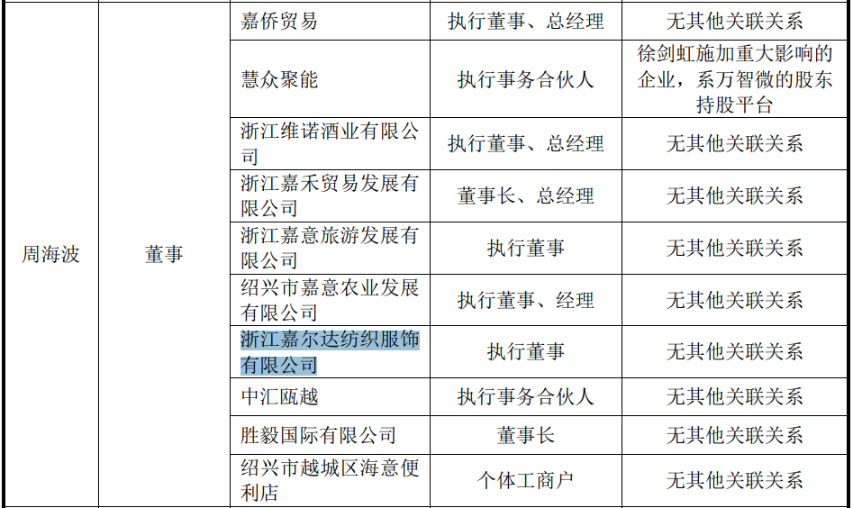 发行前,发行人的第三股东为周海波,持股占比5.83%,其担任发行人董事,同时,其控制嘉侨贸易、嘉禾贸易、嘉尔达纺织、胜毅国际等并出任董事长兼总经理职位。裁判文书网显示,其控制的嘉尔达纺织曾虚开发票1,500余万,其控制的嘉意旅游非法占用土地被当地国土局处罚并向法院申请了强制执行,