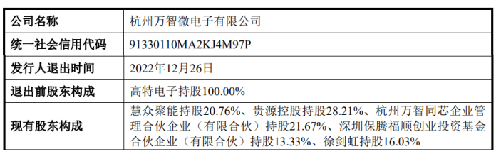 2022年12月,将万智微100%股权剥离转让,将万智微 100%股权剥离转让,由慧众聚能、贵源控股和徐剑虹按照万智微实缴注册资本500.00万元作价承接,目前,该企业的股东为发行人的实控人、控股股东及实控人、大股东担任执行事务合伙人的持股平台。