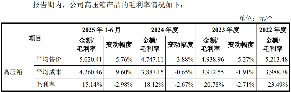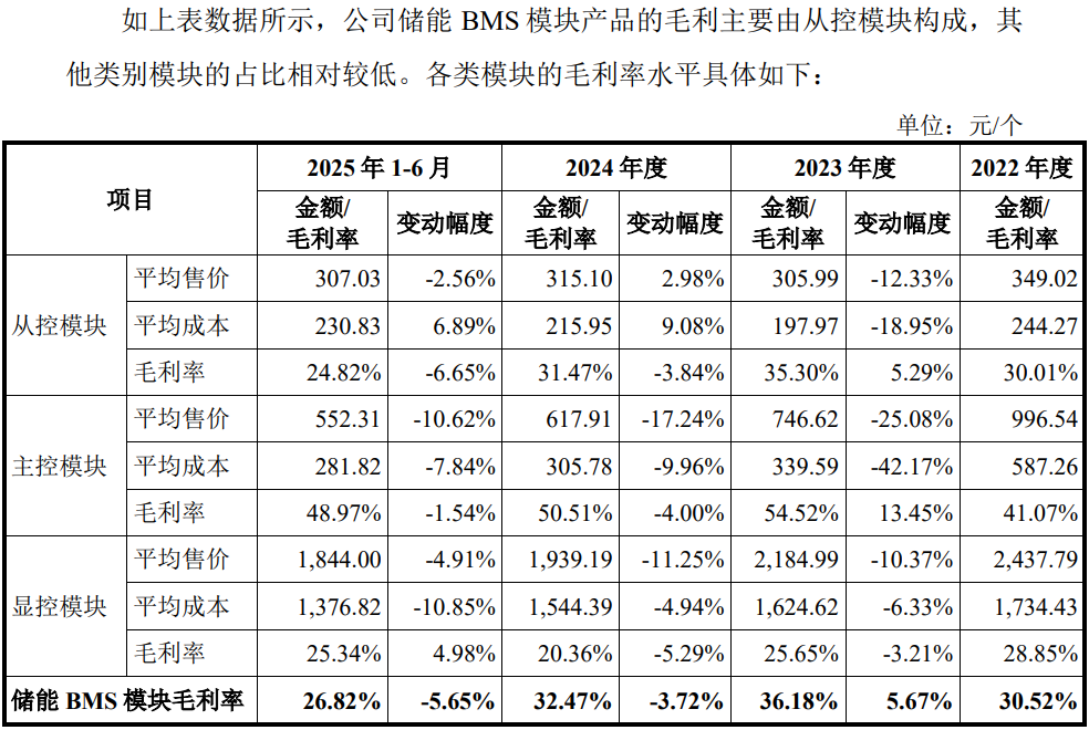 发行人毛利率下滑主要受产品价格影响。报告期内,公司的储能BMS模块产品、高压箱产品、汇流柜产品等主要产品售价均出现了整体下滑,各类产品毛利率均波动下滑,同时,报告期内,公司一体化集成母排CCS及线束产品的毛利率分别为 16.36%、14.66%及 2.17%、7.83%,整体呈下降趋势。