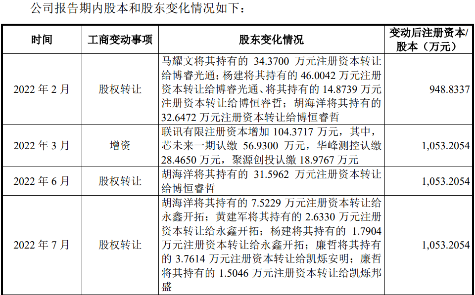 同时,上海乘讯的创始股东邵毅男现为发行人的研发总监,为公司的核心技术人员、其间接通过员工持股平台持有发行人1.87%股份,与胡海洋一起入股的周海峰为发行人员工,为持股平台博睿光通(直接持有公司6.94% 的股份)的执行事务合伙人,间接持有联讯仪器5%以上股份,均是2018年1月退出股东身份。
