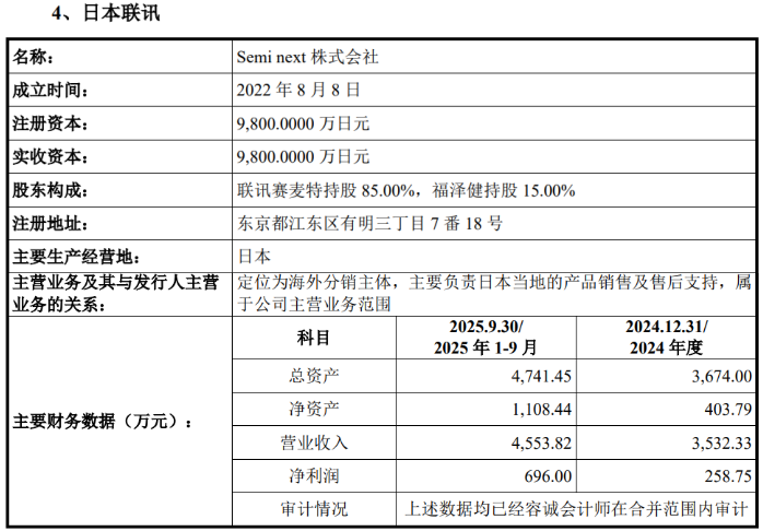2022年12月29日,发行人以现金方式增资日本联讯并取得其控制权,为此形成商誉25.81万元,但并未披露详细的收购价格。截至目前,该公司两名股东中,除发行人子公司联讯赛麦特持股85.00%外,福泽健持股15.00%。