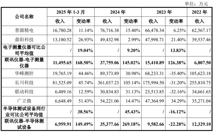 2023年、2024年和2025年1-3月,公司收入增长率分别为126.38%、145.02%和168.50%,电子测量仪器可比公司收入增长率平均值分别为13.83%、 9.20%和19.04%,增速分别高出同行约113个百分点、136个百分点和149个百分点。
