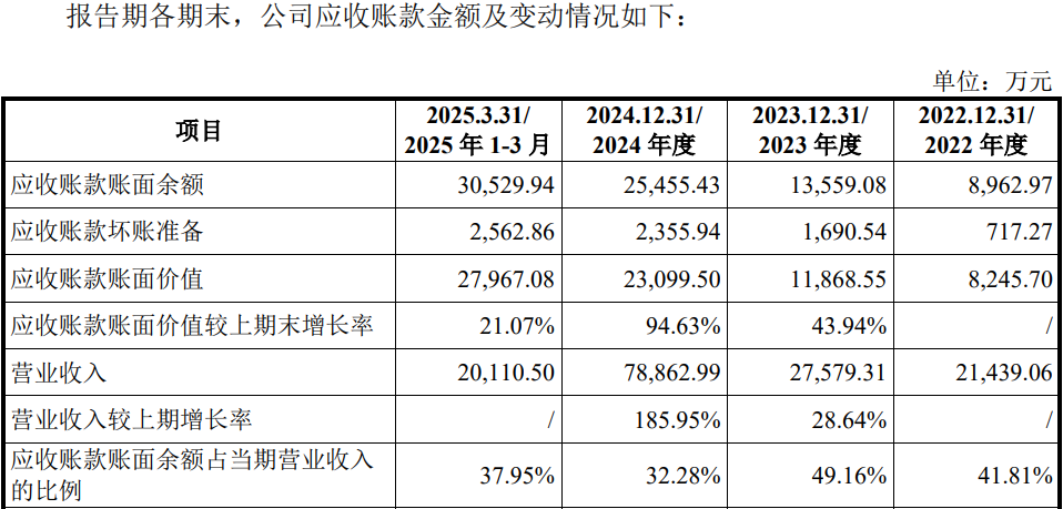 报告期各期末,公司应收账款的账面余额分别为8,962.97万元、13,559.08 万元、25,455.43万元和40,001.69万元,占当期营业收入的比例分别为41.81%、49.16%、32.28%和37.24%,2023年、2024年,应收账款账面价值增速分别为43.94%、94.63%。