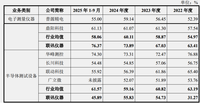报告期内,公司综合毛利率分别为43.61%、60.50%、63.63%和59.14%,其中电子测量仪器毛利率分别为63.41%、67.03%、73.89%和76.37%,逐年增长,2023年-2025年1-9月变动趋势不一,同行出现波动,发行人持续攀升。半导体测试设备毛利率分别为31.27%、54.73%、55.83%和45.89%,整体低于同行毛利率,变动趋势与同行存在差异,2023年增长较快,最新一期回落较大。