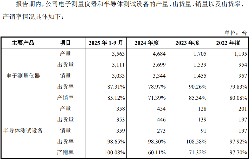 招股书显示,公司此次募资约17.11亿元,主要用于下一代光通信测试设备研发及产业化建设项目等5个项目,但报告期内的公司产品的出货率和产销率均出现了波动,尤其是半导体测试设备,2025年前三季度的产量和出货量约2024年的3/4水平,并没有出现明显的增长。
