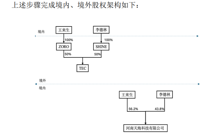2006年9月,TEC收购天海科技,王来生和李德林与TEC签订《股权并购协议》,王来生和李德林将其持有天海科技股权全部转让给TEC,同时,为了保持境内外持股比例一致,Shine将其持有的TEC的部分股权转让给Zoro;转让后,Zoro 持有TEC的股权比例56.20%,Shine 持股占比为43.80%。