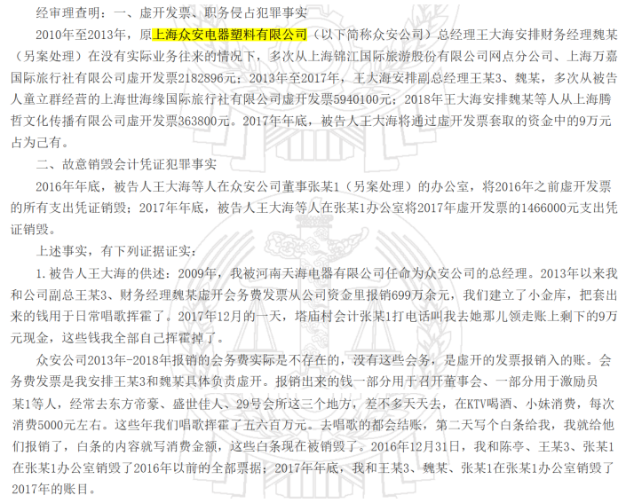 据鹤壁市淇滨区人民法院发布的案号为(2019)豫0611刑初241号的《王大海、童立群虚开发票、职务侵占、隐匿、故意销毁会计凭证、会计帐簿、财务会计报告一审刑事判决书》显示,原上海众安电器塑料有限公司总经理王大海于2010年-2018年安排财务经理魏某(另案处理)在没有实际业务往来的情况下,多次从上海锦江国际旅游股份有限公司共虚开发票约848.68万元。2013年以来其和公司副总王某3、财务经理魏某虚开会务费发票从公司资金里报销699万余元,我们建立了小金库,把套出来的钱用于日常唱歌、找小妹等挥霍消费。
