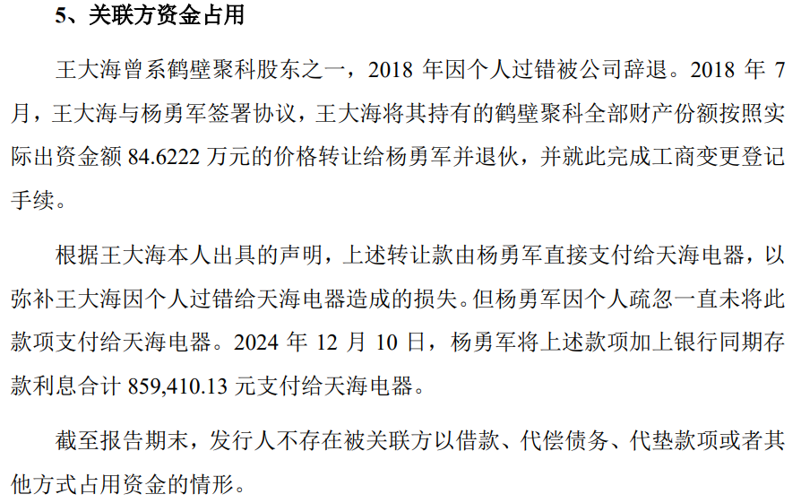 王大海原为发行人股东,其持有鹤壁聚科(发行人第五大股东,发行持股占比4.5901%)约84.62万元的出资额,由于东窗事发后,其被辞退,且持有的财产份额转让给杨勇军(曾任发行人副董事长2023年辞任),并由其转让给天海电器,但其直到6年多后才转让给天海电器。