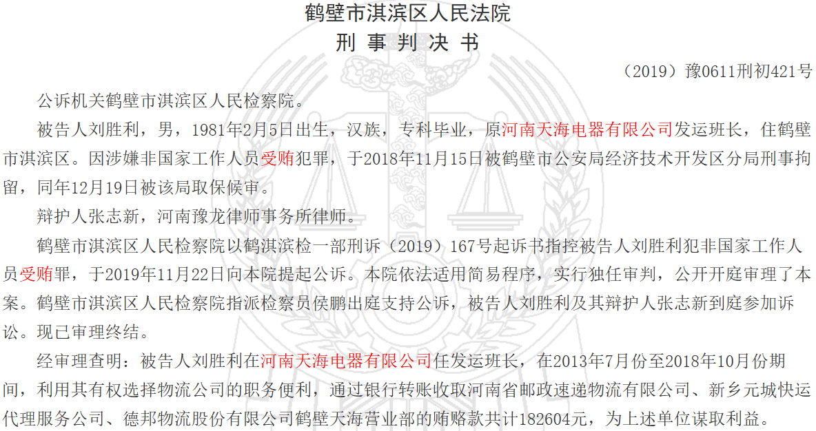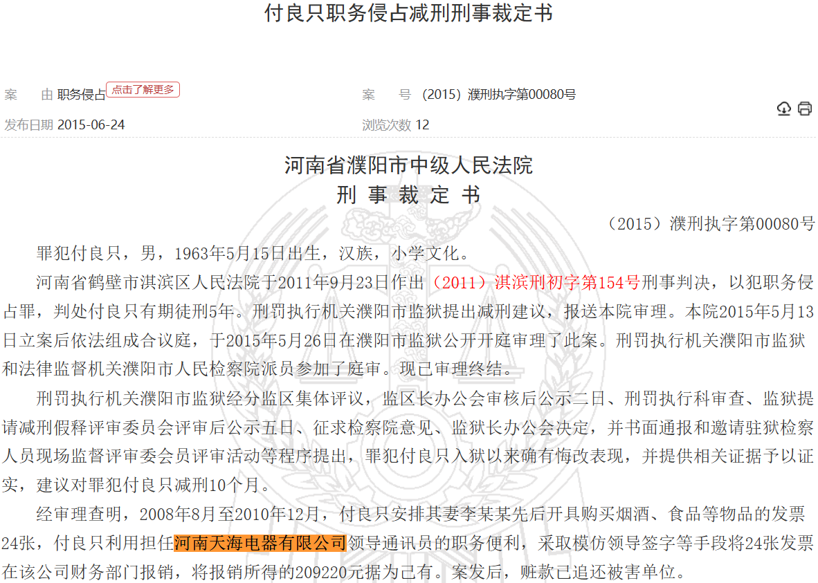 裁判文书网显示,发行人重要子公司天海电器还发生了其他两起员工职务侵占案件。