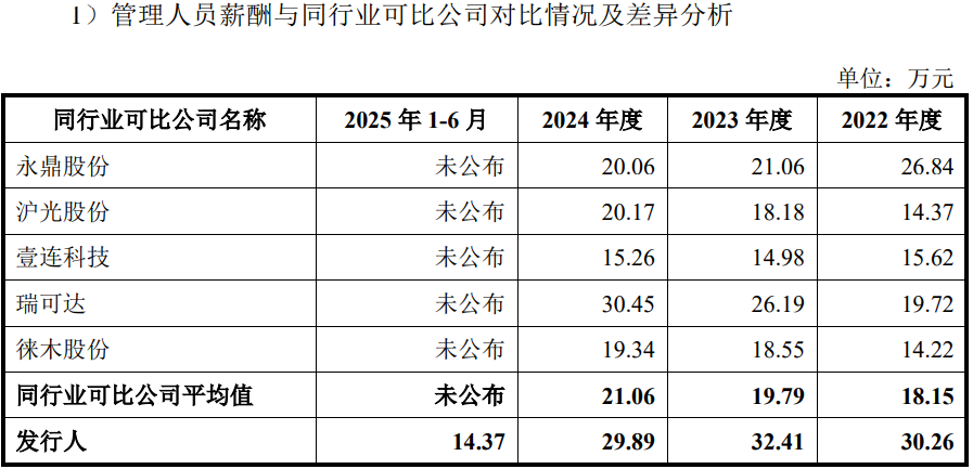 不过,发行人的管理人员的薪酬高于同行,除2024年,略低于瑞可达外,其他各期均高于同行,2024年,高管除刘玉国年薪156.41万元外,其他更是均在200万元以上,总裁郭得岁及董事董立刚更是接近300万元。