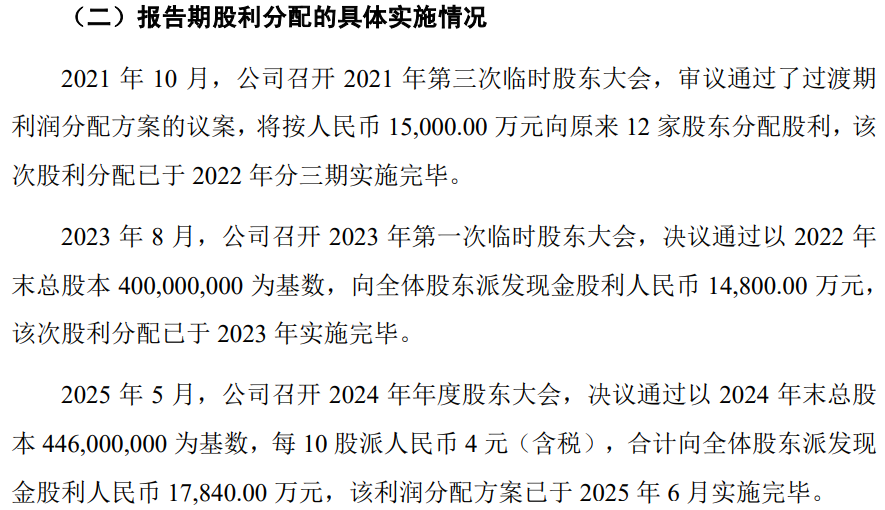报告期内,发行人共实施了三次分红,累计金额约47,640万元,其中,1.5亿元是向原来12家股东分配的。