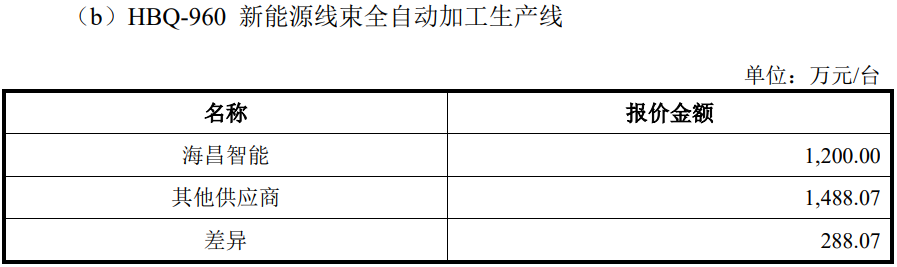 采购价格方面,发行人对海昌智能的采购价格多数低于其他供应商,其中,HBQ-902多线型加工中心设备、HBQ-960新能源线束全自动加工生产线设备、装配设备和装配设备的采购价格较其他供应商分别低了35.98%、19.36%、18.32%和51.63%。