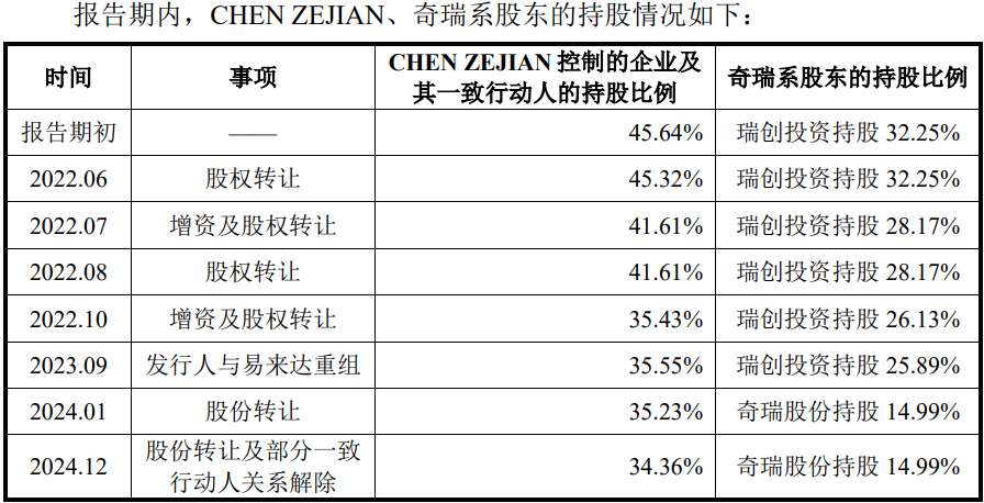 报告期内,公司又进行了多轮增资及股权转让,CHENZEJIAN、奇瑞系控股比例均不断稀释股份,尤其是奇瑞系持股比例缩减一半。