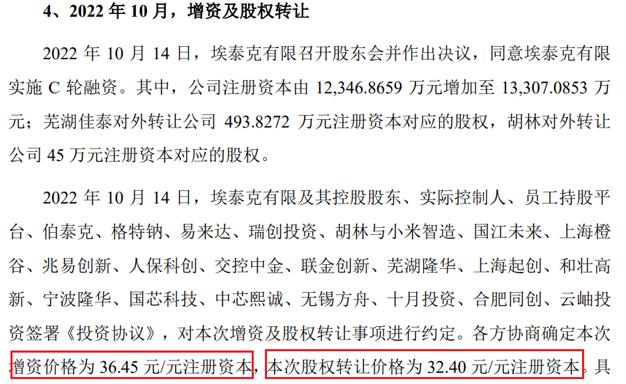 在上述增资及股转中,还出现了同股不同价。2022年10月的增资价格为36.45元/元注册资本,而股权转让价格为32.40元/元注册资本。