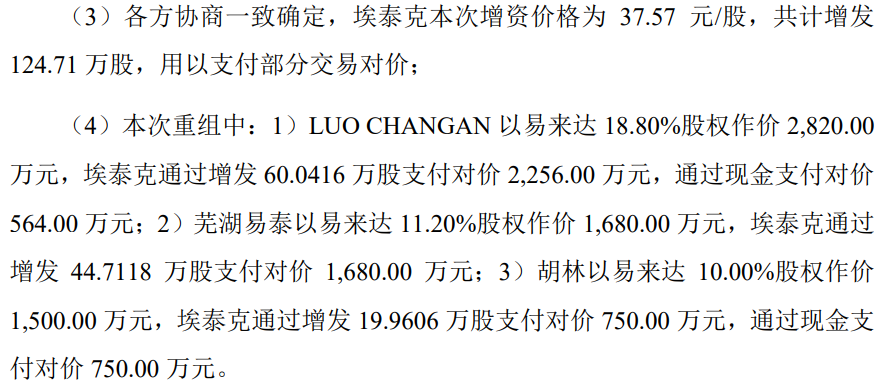 2023年9月,埃泰克通过发行股份及支付现金方式收购易来达少数股东持有的40.00%,交易的价格为6,000.00万元,使其成为埃泰克全资子公司,该公司原40%股权分别由LUO CHANGAN(美国籍,发行核心员工),员工持股平台芜湖易泰及发行人股东胡林共同持有。