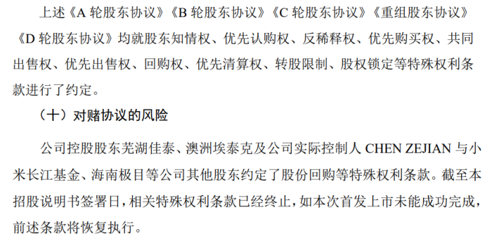 招股书显示,发行人共进行了A、B、C、重组和D轮五次融资,部分股东入股公司时,曾与公司以及控股股东芜湖佳泰、澳洲埃泰克、实际控制人CHEN ZEJIAN签署相关协议并约定了股东特殊权利条款,仅B、C两轮融资额便高达71,964.87万元。