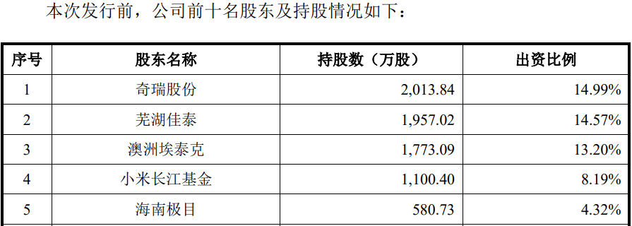 截至发行前,公司的股东达50家,其中,第一股东为奇瑞汽车股份,第二、第三股东分别为CHENZEJIAN控制的芜湖佳泰(CHEN ZEJIAN持有100.00%股权)、澳洲埃泰克(CHEN ZEJIAN持有95.00%股权,其配偶REN LANFANG持有5.00%股权),同时,该两名股东也为发行人共同的控股股东。