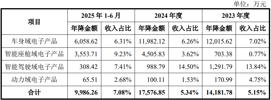 而下游客户的降价会要求上游供应商采取降低,报告期内,发行人涉及年降的产品包括车身域电子产品、智能座舱域电子产品、智能驾驶域电子产品和动力域电子产品等。