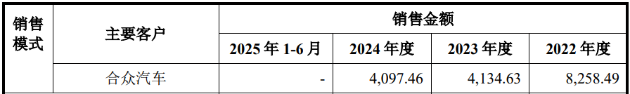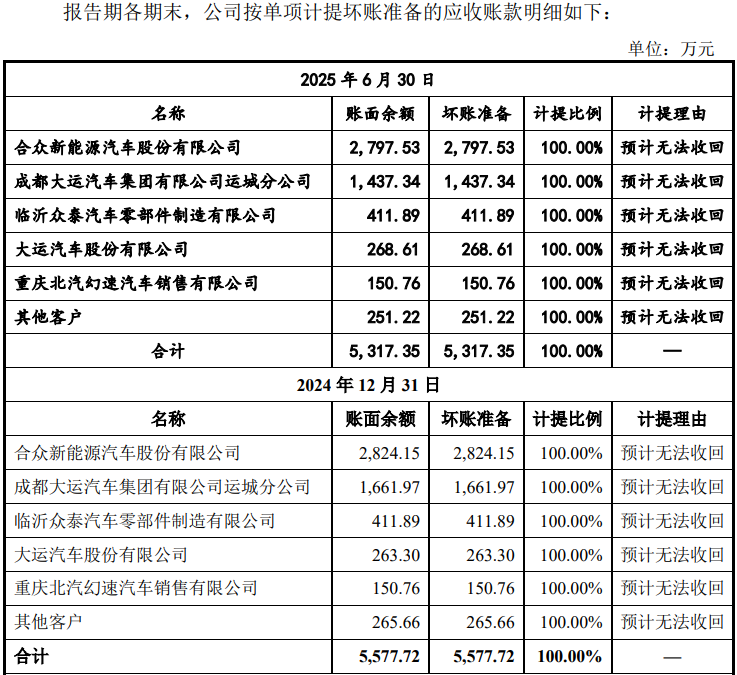 2022-2024年,公司累计对其销售约1.65亿元,均采用寄售的销售方式,2024年下半年,合众汽车出现了经营恶化、资金链断裂,开始全面停产和裁员;2025年6月,其进入破产重整程序,发行人对其2,797.53万元无法收回,全额计提坏账。