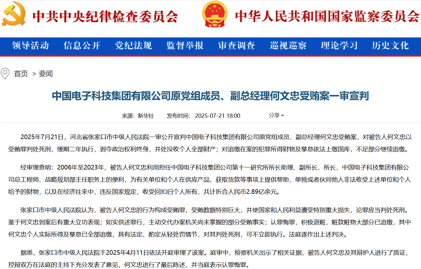 2025年7月,河北省张家口市中级人民法院一审公开宣判中国电子科技集团有限公司原党组成员、副总经理何文忠受贿案,对被告人何文忠以受贿罪判处死刑,缓期二年执行,剥夺政治权利终身,并处没收个人全部财产。