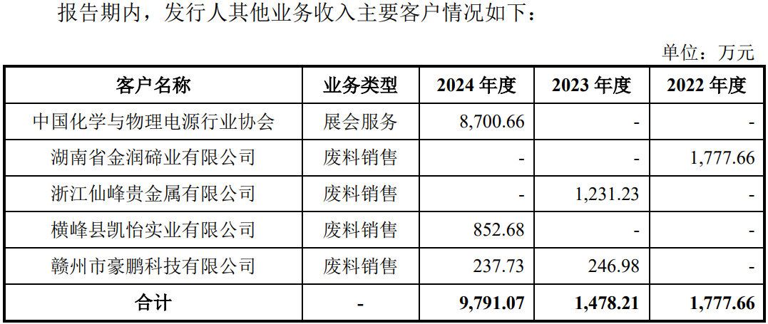 招股书显示,发行人向中国化学与物理电源行业协会的销售主要集中在2024年和2025年上半年,两期对应的销售金额分别为9,324.27万元和 12,720.20万元,2025年上半年,该协会跃升成第二客户。公司称,发行人2024年、2025年承办了协会组织的16届、17届展会,为其提供了展会服务。