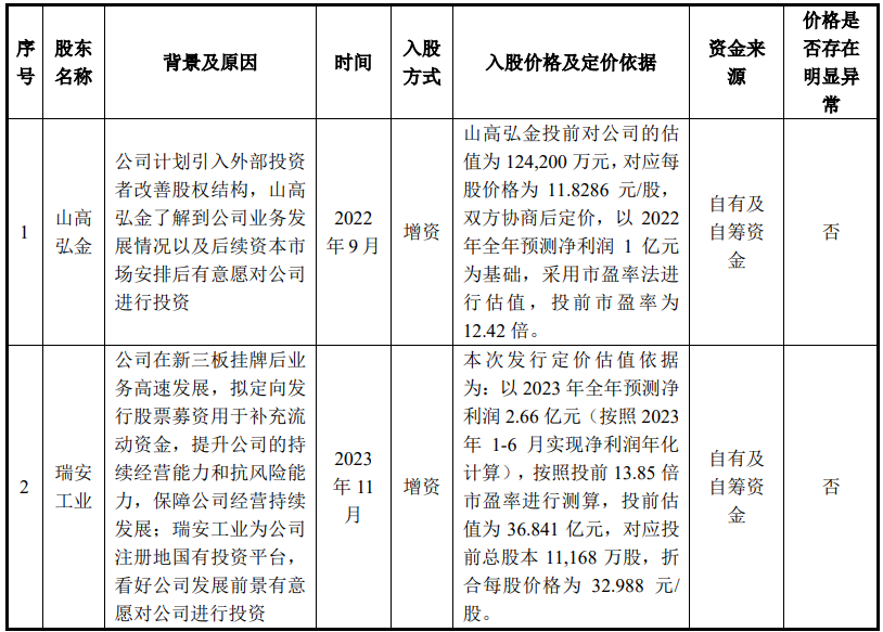 除黄胜全控股外,发行人还引进了外部股东山高弘金、瑞安工业,其中,山高弘金于2022年9月以现金6,900.00万元的价格认购公司新增股份5,833,333股;瑞安工业为国有控股企业,于2023年11月以现金9,210.25万元认购2,792,000股。