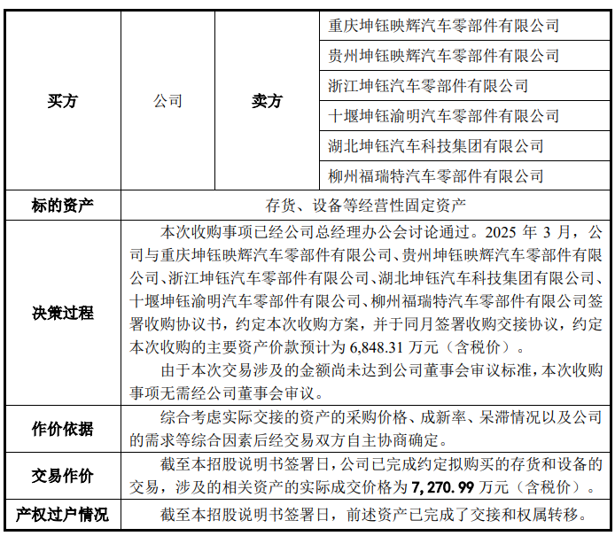 除了收购成都双胜资产外,2025年3月,发行人还斥资7,270.99万元收购了重庆坤钰等6家公司的存货、设备等经营性资产,招股书称,交易涉及的金额未达到董事会审议标准,故无需经董事会审议。