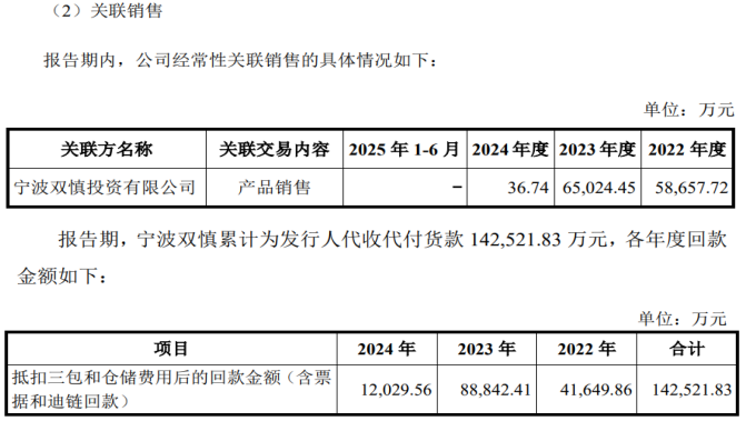2022年至2024年,发行人向宁波双慎销售的金额分别为58,657.72万元、65,024.45万元和36.74万元,累计向关联方销售123,718.91万元。报告期内,宁波双慎累计为发行人代收代付货款142,521.83万元。
