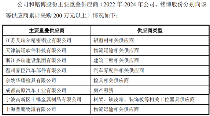 除了与实控人控制的宁波双慎共用多家供应商外,发行人与关联方铭博股份还共用交易额在200万以上的供应商8家,同时,存在5家重叠客户。