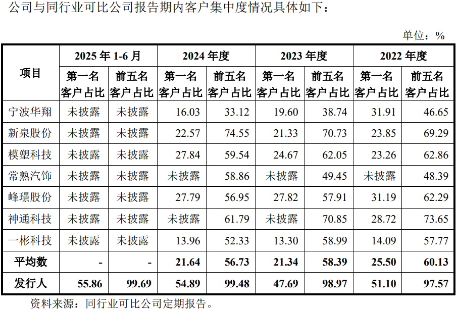 报告期内,公司前五大客户占年度销售额比例分别为97.57%、98.97%、99.48%和99.69%,客户集中度较高,大幅高于同行,2022年-2024年,同行对前五客户的销售占比平均值分别为60.13%、58.39%、56.73%。