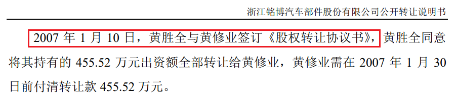 然而,根据铭博股份公开转让说明书,2007年1月10日,黄胜全与黄修业签订《股权转让协议书》,黄胜全同意将其持有的455.52万元出资额全部转让给黄修业。