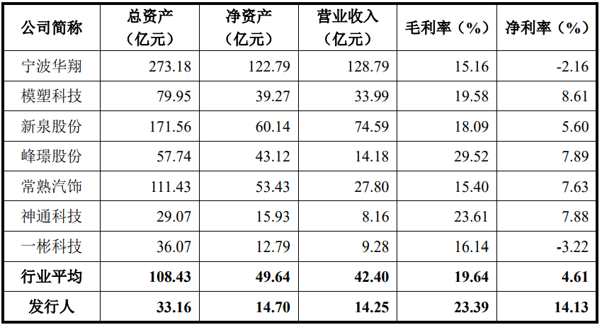 从经营规模来看,发行人均上市同行中靠后水平,总资产及净资产不及同行平均值得1/3,营业收入略高于同行平均值的1/3,不过,公司的毛利率仅低于峰璟股份排名行业第二,净利润率更是碾压同行排在首位,高于均值10个百分点。