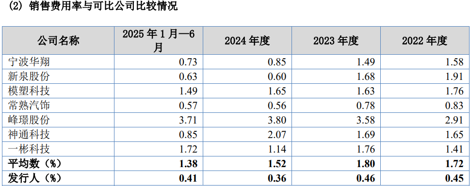 报告期内,发行人的销售费用率分别为0.45%、0.46%、0.36%及0.41%,不及同行均值的1/3投入,同时,管理费用率及研发投入占比也显著低于同行,尤其是研发投入,同行逐年投入占比加大,发行人投入占比出现波动下滑。