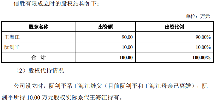 资料显示,发行人前身诸暨市信胜缝制设备有限公司(后更名浙江信胜缝制设备有限公司,简称“信胜有限”)设立于2004年1月,由王海江、阮剑平与分别出资90万元、10万元,阮剑平系王海江原继父,目前与王海江母亲已离婚,其持有10万出资额系代王海江持有。