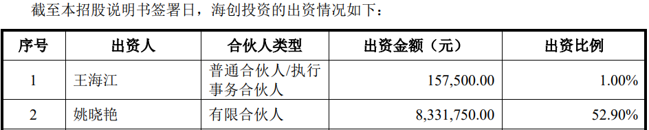 为稳定与激励员工,发行人又于2018年7月设立员工持股平台海创投资,并通过增资的方式成为股东,不过,海创投资持有出资额比例最多的是姚晓艳,其持股比例达52.90%,而其他18名员工共同持股比例不足47%。