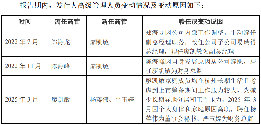 报告期内,发行人高管经历了三次变更,郑海龙降职后于2025年9月从发行人辞职,陈海峰、廖凯敏个人原因辞职,离职时郑海龙,陈海峰退出了员工持股平海创投资,但发行人保留了廖凯敏部分海创投资的出资股份。