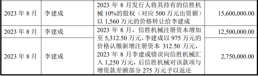 据招股书,引进李建时发行人便将子公司信胜机械的10%股权装让给他,且在同时增资的时候李建成打款时还出现了“乌龙”。