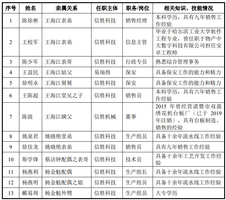 其中,王海江担任发行人董事长、总经理和研究所所长,姚晓艳担任董事,同时,双方的10多名亲属在发行人或子公司信胜机械担任销售经理、董事、生产组长等。