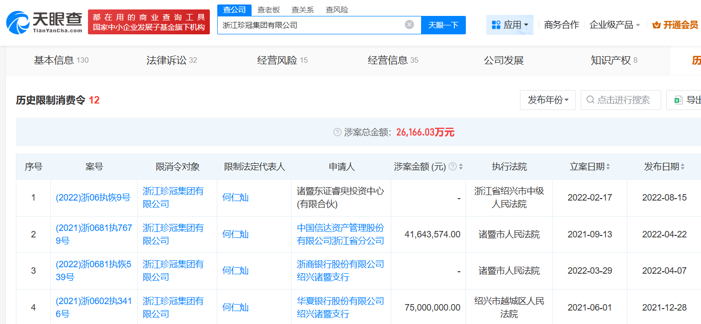 天眼查显示,七大洲小贷涉及司法案件200多起,其中最大股东浙江珍冠集团有限公司(原名浙江七大洲集团)曾存在失信和“限消”,涉案金额分别达1.1亿元和2.62亿元,同时七大洲小贷持股5%的股东众圣集团有限公司也为失信和“限消”单位。