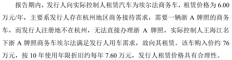 发行人在向控股股东出售汽车的同时,又向实际控制人租赁汽车为埃尔法商务车,租赁价格为6.00万元/年,在杭州地区进行商务接待。