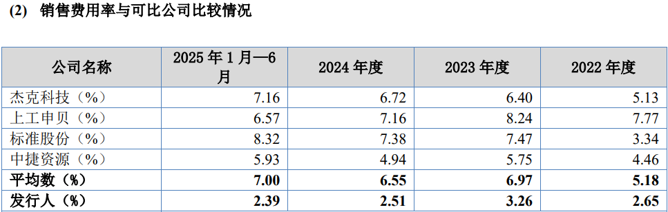 报告期内,发行人研发费用率分别为3.91%、3.63%、3.15%和2.77%,逐期下降,显著低于同行,同时,发行人的销售和管理费用率则更低,不及同行均值的一半。