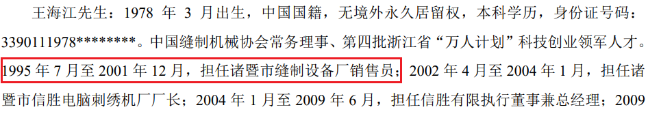 信息披露方面,招股称实控人王海江曾于1995年7月至2001年12月,担任诸暨市缝制设备厂销售员,但根据工商资料显示,该企业成立于1998年7月,较其履职开始的时间晚了3年多。